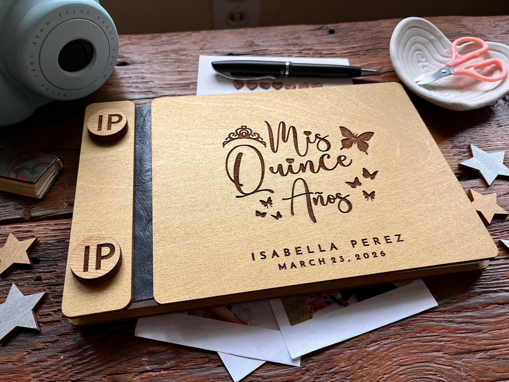 Gold Quinceaneara Guest Book with Engraved Crown and Butterflies, Wood Personalized notebook album for Quinceañera, Sweet 16, Bat Mitzvah)