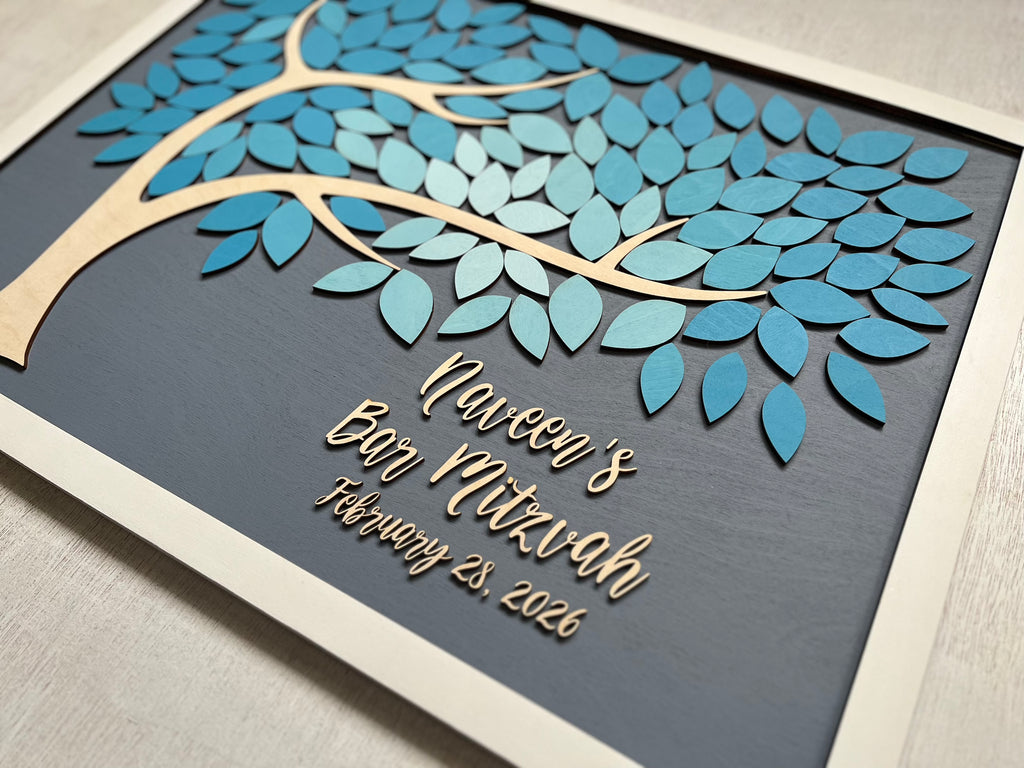 This is a Bat/Bar/B'nai Mitzvah guest book alternative also suitable for a sweet 16 or Quinceanera /quince guestbook. It is made with a tree and personalized text; your guests will be signing the leaves, so you have a memory of this sweet milestone.