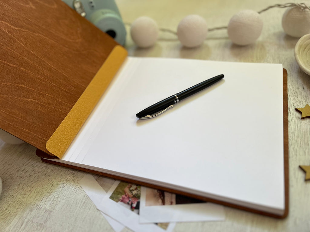 • Your choice of paper type and number of sheets (the standard paper is 28lb FSC certified paper; the cardstock paper is 65lb acid free cardstock available in classic white or black; we recommend black if you are planning on adding photos or polaroids to your Bat Mitzvah guest book